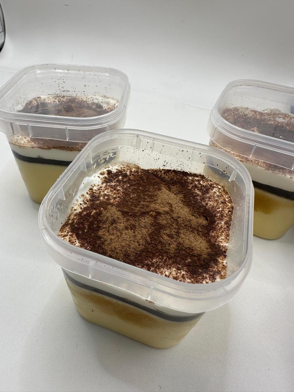 Pudim tradicional, fina camada de gelatina de café, creme de leite fresco batido e finalizado com cacau em pó.